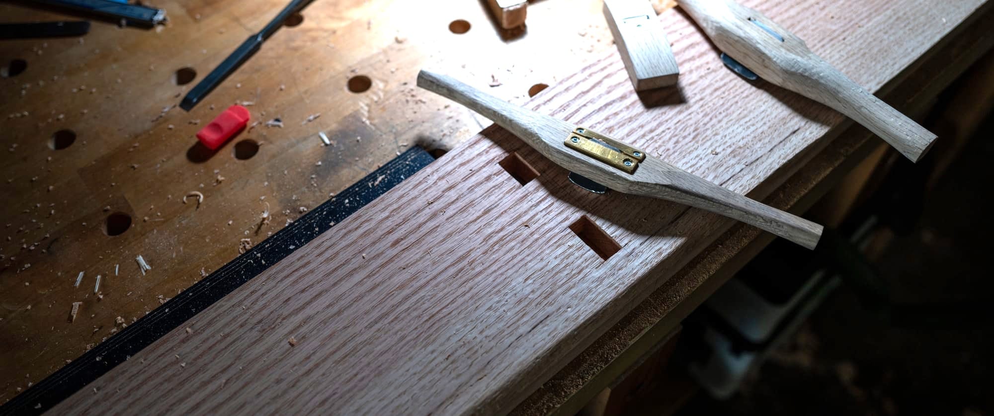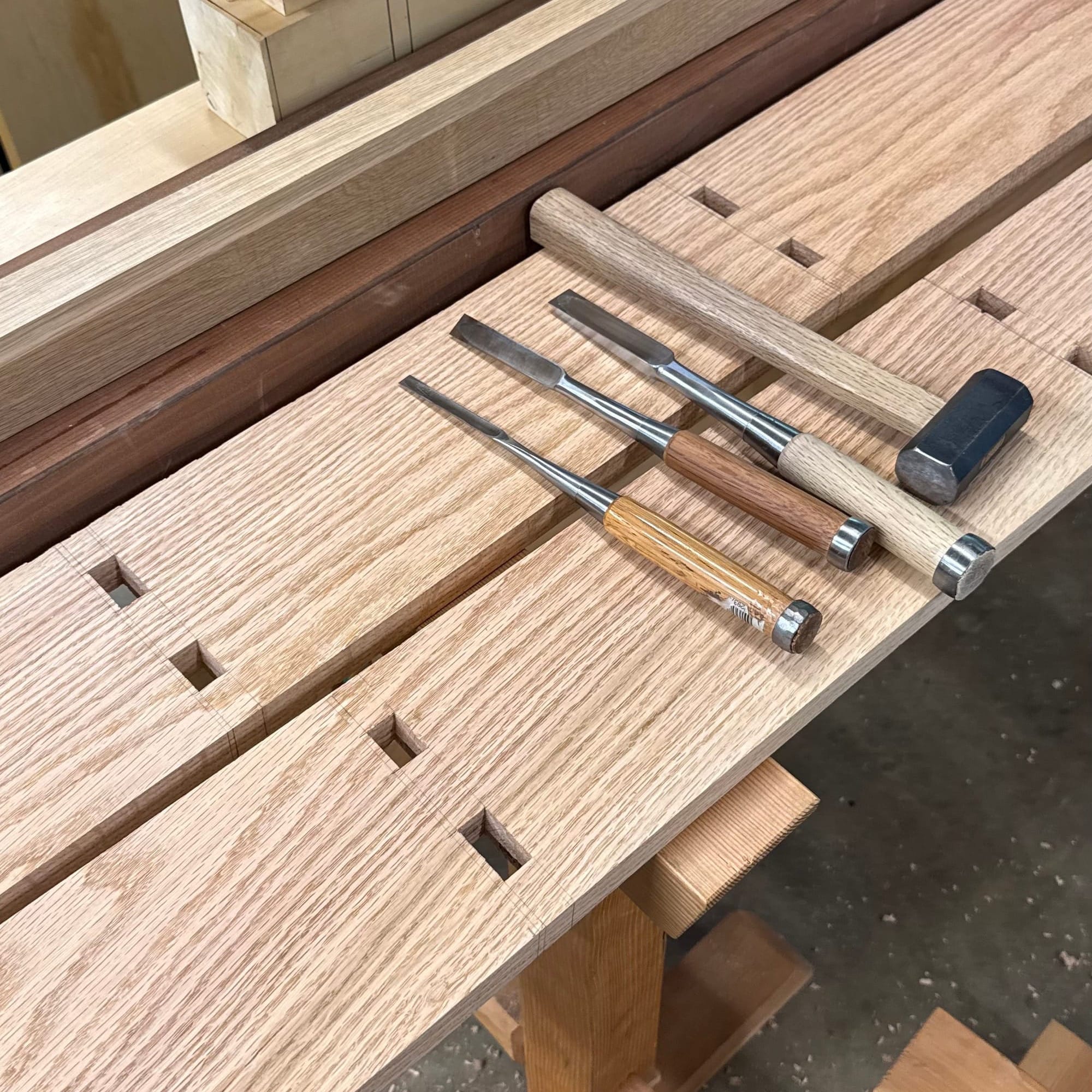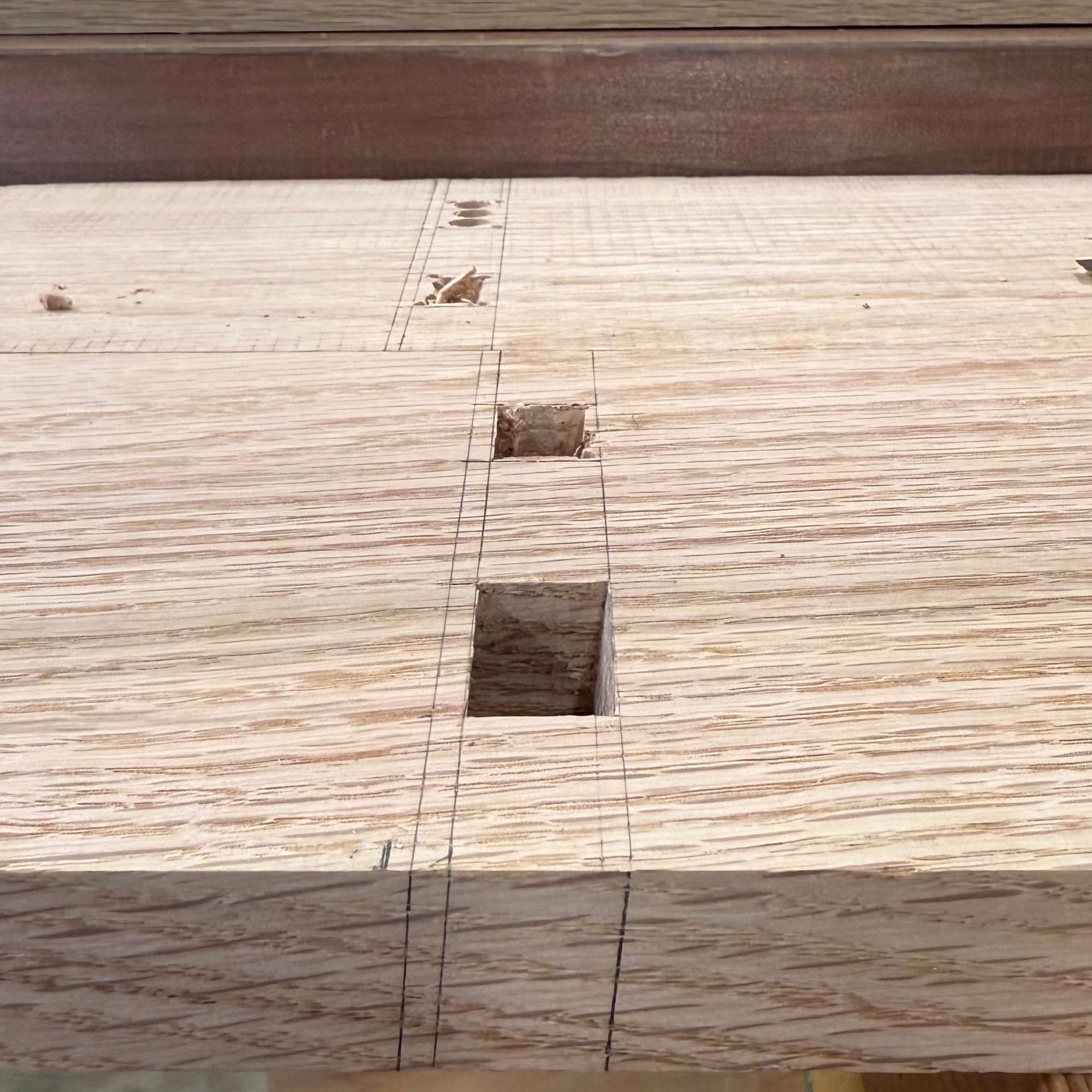 Mortises were drilled out, cut by hand using HSS timber chisels (real bangers, those things) and a heavy hammer. Angled mortises were done by connecting the top and bottom lines and keeping an eye on the layout line on the edge of the board. Not too bad.