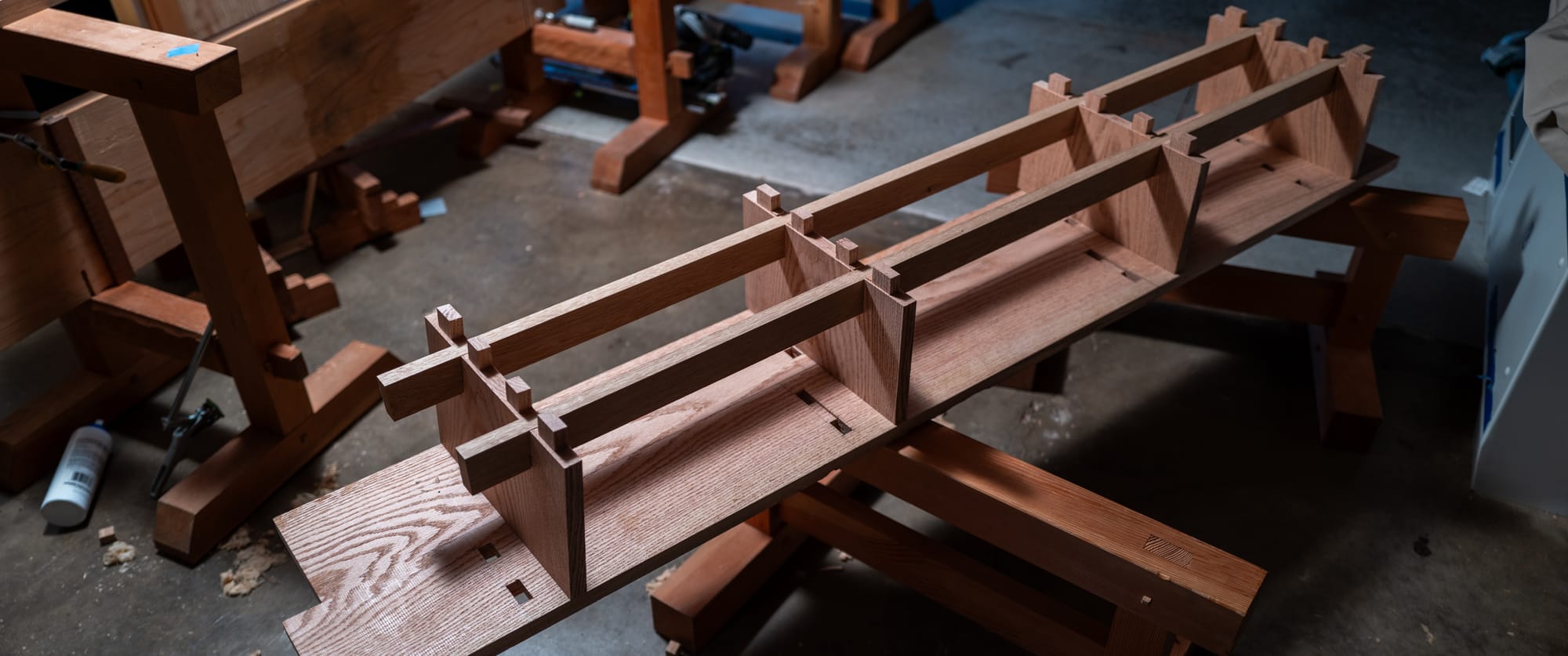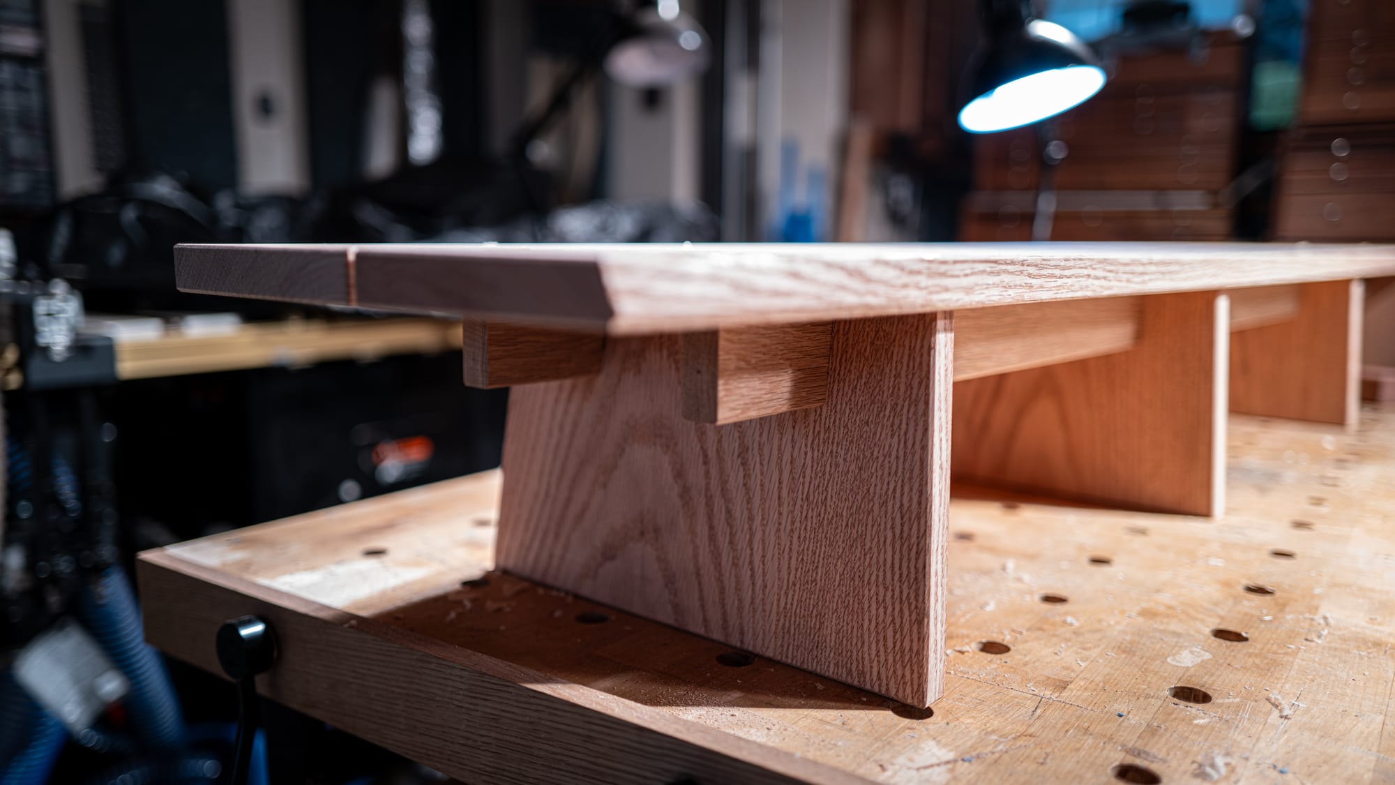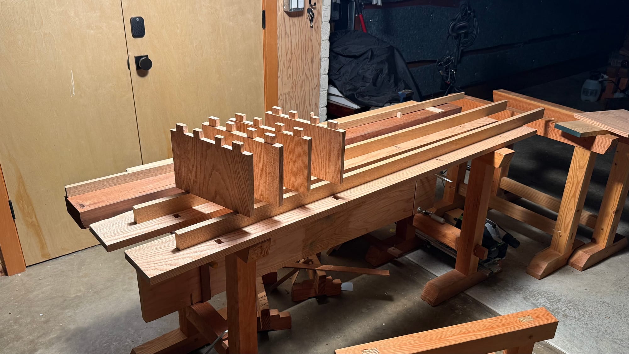 Overbuilding is frowned upon in furniture building, but for someone with my tendency to over do things because of concern and lack of experience, it's a thing I like to do. It's also because of the feelings of safety one gets from stouter timber frame carpentry design languages. So I don't mind going really crazy on strength. I had a wide board of red oak and some white oak scraps that I thought would be good material for this project and too coarse for other things.