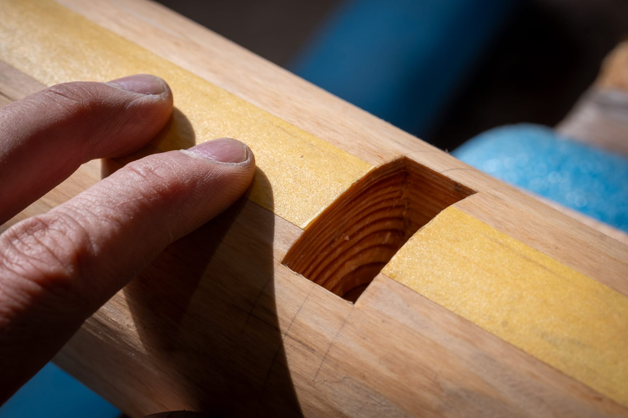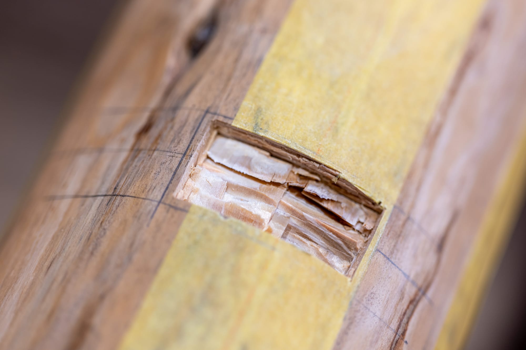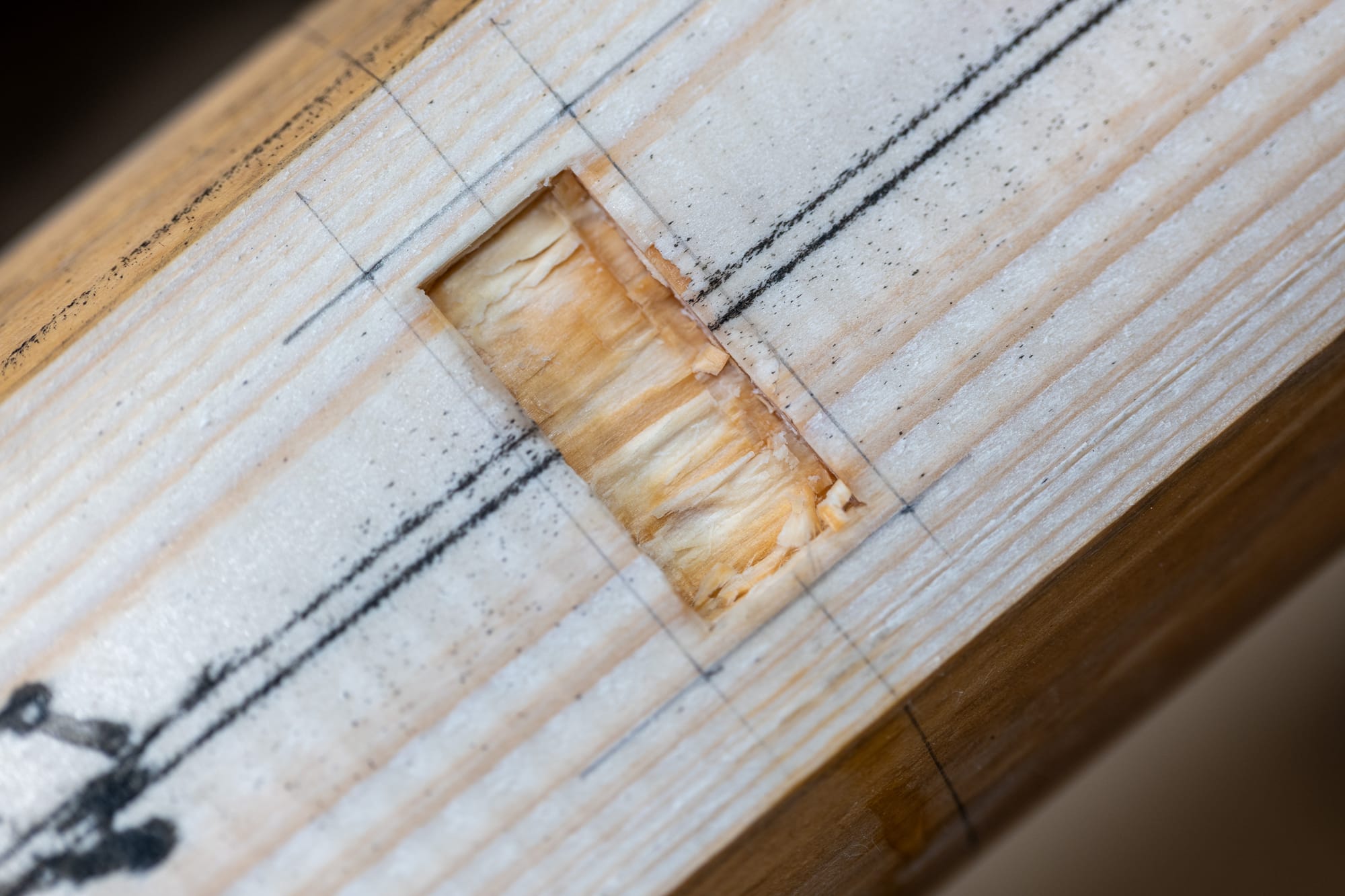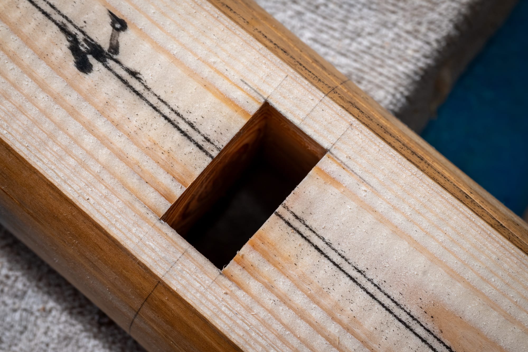 Then, I cleaned out the waste to 0.1mm, starting by reaching into the corners to define the rectangle. With a fresh wide chisel, I pared to split all lines, connecting the corners. With a small rule, I checked the mortise had no humped sections that would interfere with the tenon.