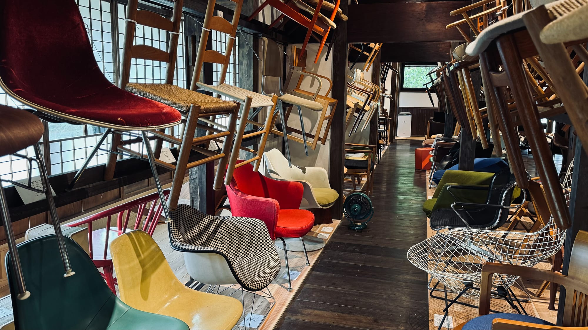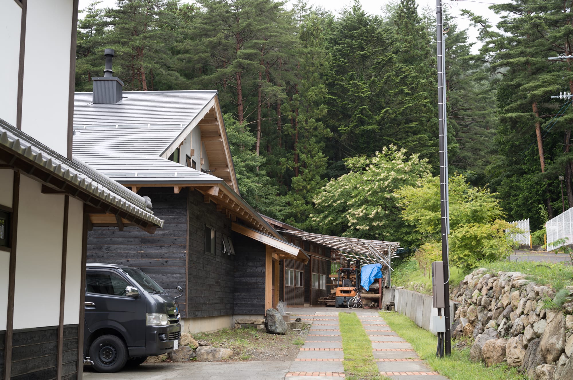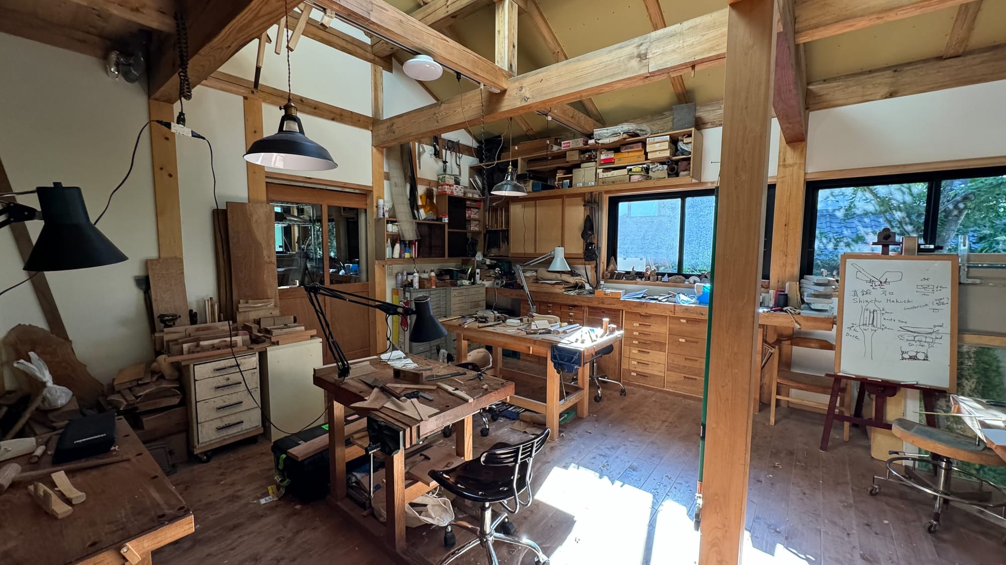There were four buildings off the main road: Tak and Junko’s house; the chair laboratory museum; the hand tool and machine shop. Past that, there is a warehouse to dry trees felled and milled from the rest of the 3-acre property. Even though built in a traditional timber framed style, these structures only sprung up in the last 2 years as Tak Yoshino’s 20-year old dreams of a place for a woodworking community came to life.