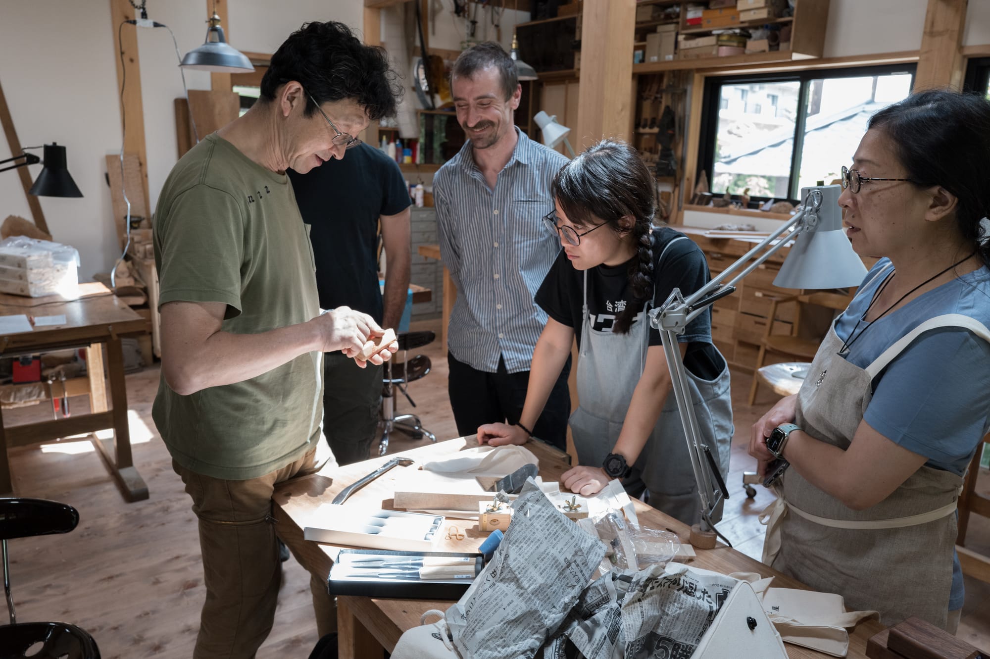Our class had 2 beginners, one person who had taken a class before, a professional, and someone (me) who was neither a beginner nor a professional. I unpacked my giant pelican case of tools, which Tak inspected carefully. And then, were arranged by Tak on benches in order of seniority.