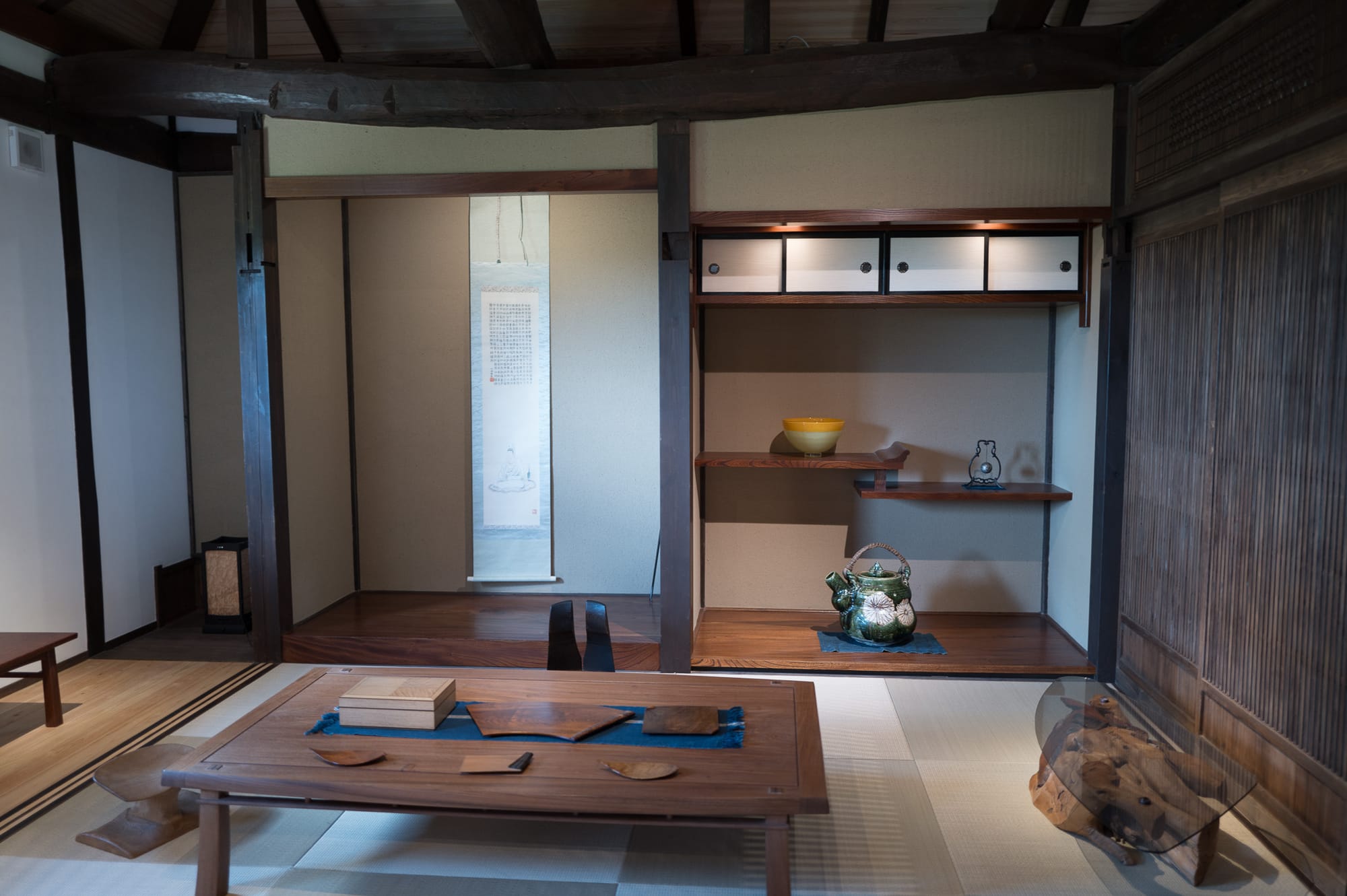 A tatami room in the chair lab holds various cabinets, trays and a table meant for tea ceremony.