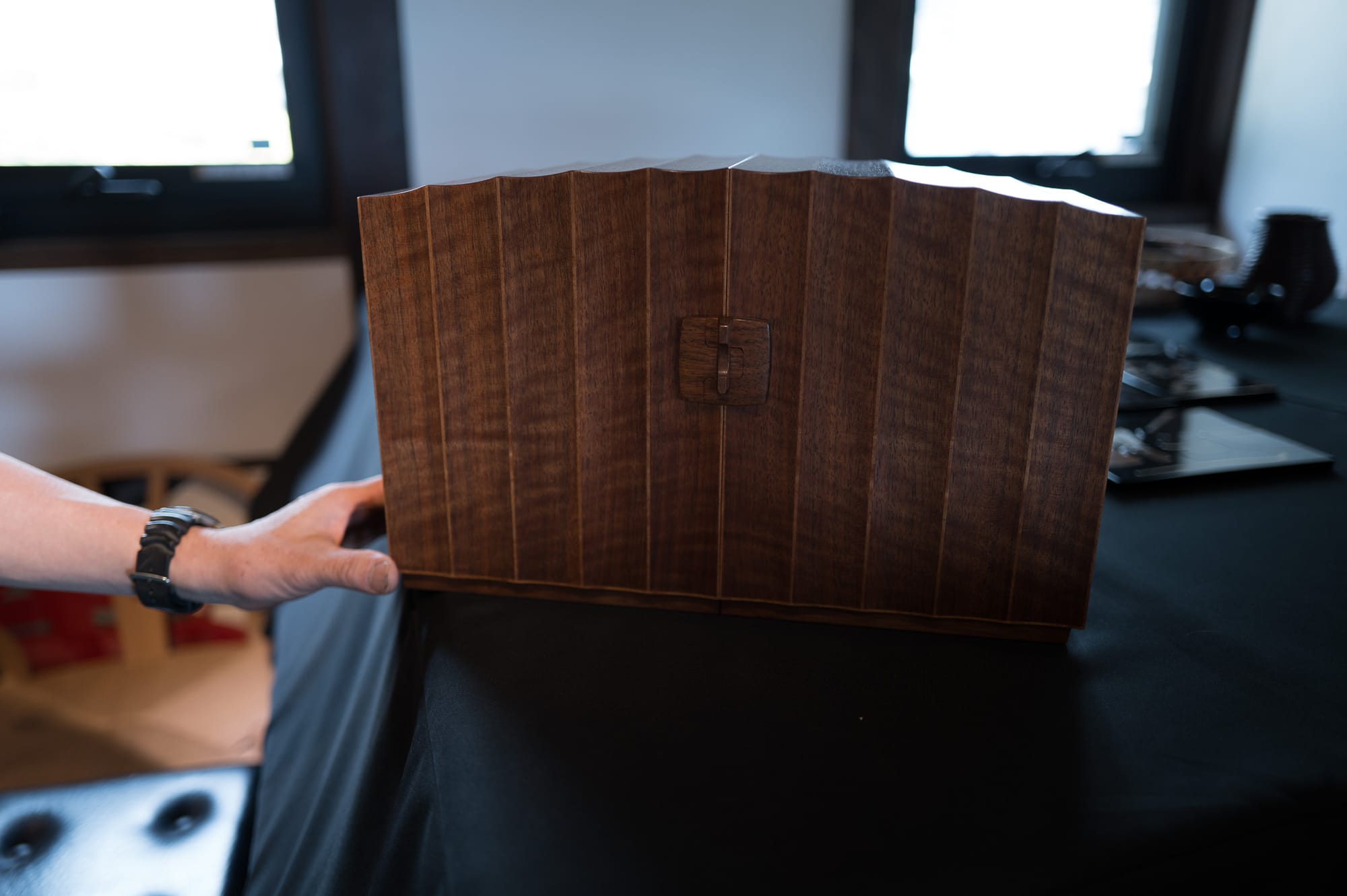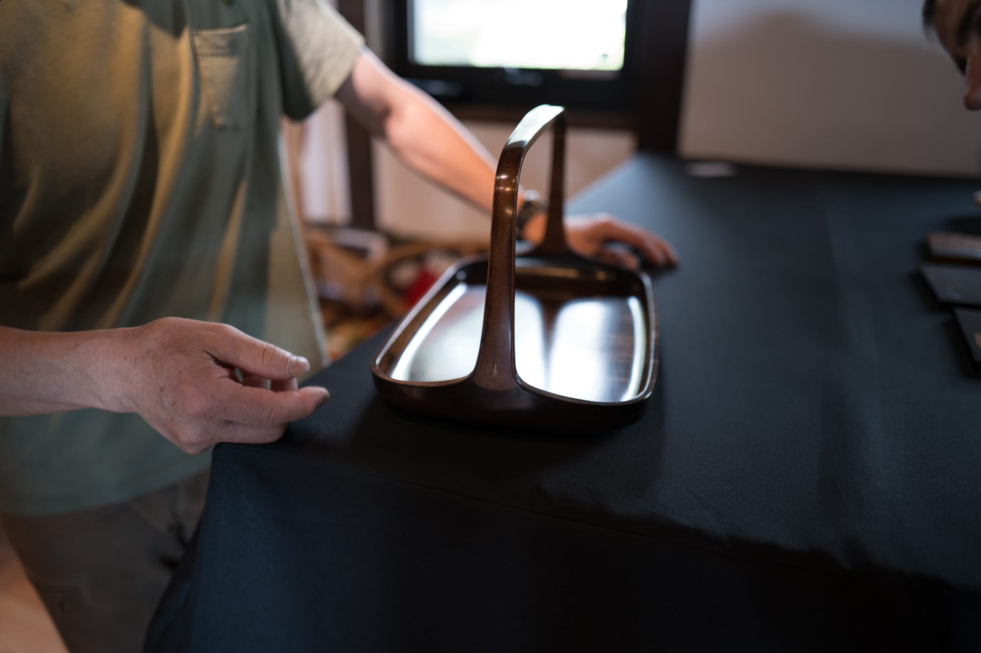 Next Tak-san showed us a cabinet with curved cross sections. Sashimono is generally straight or with some gentle angularity. Tak’s work is free flowing and unrestricted by rectilinear geometry, made capable with his custom planes, and his jazz mind.