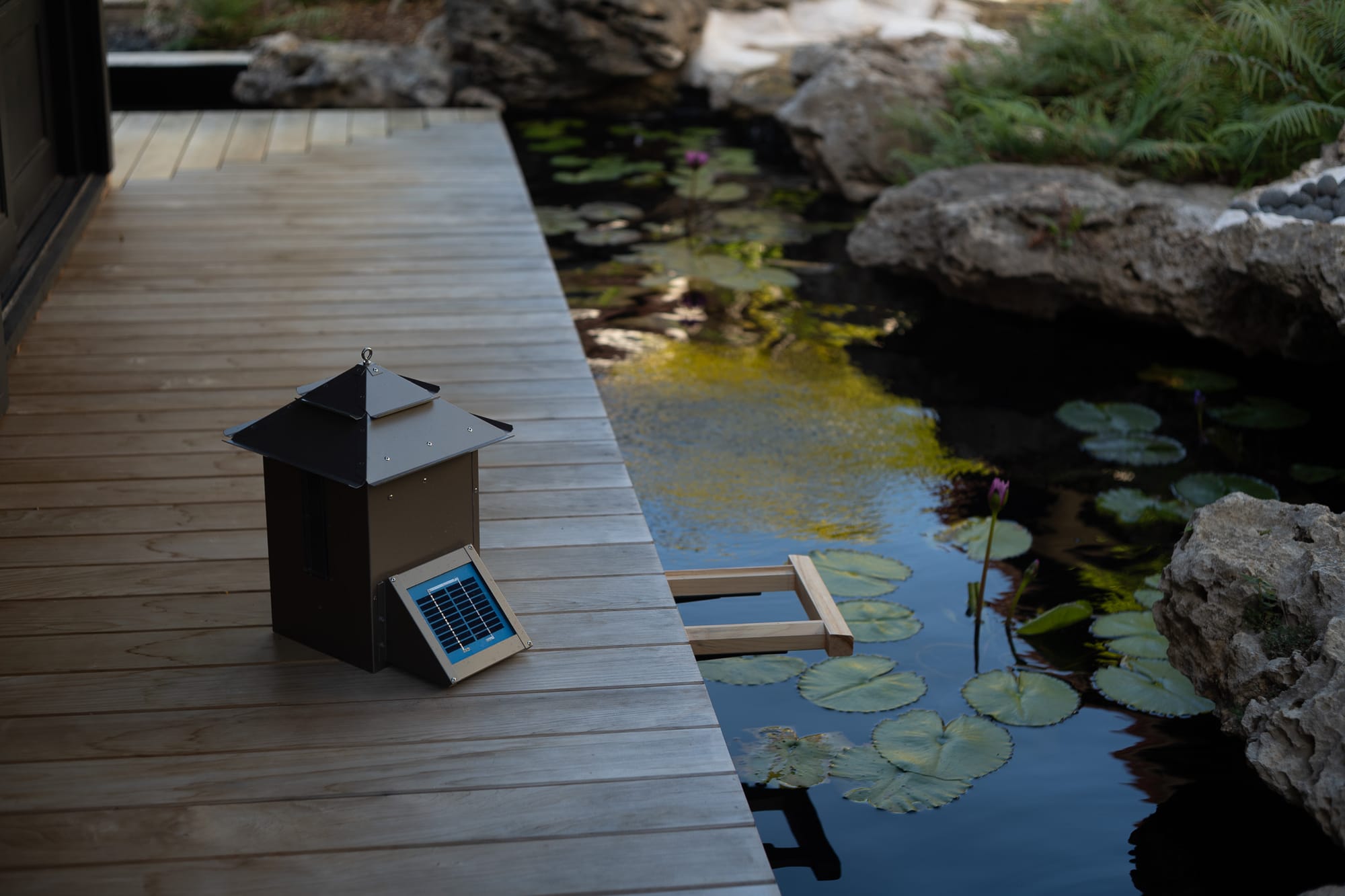 I also finished up a small frame to hold a koi pond feeder, mounted on the side of the walkway.